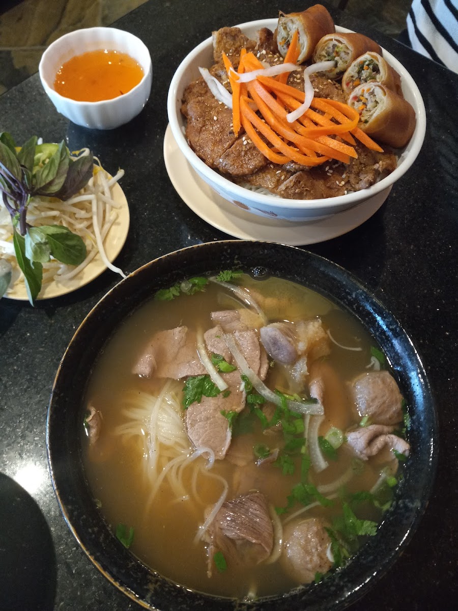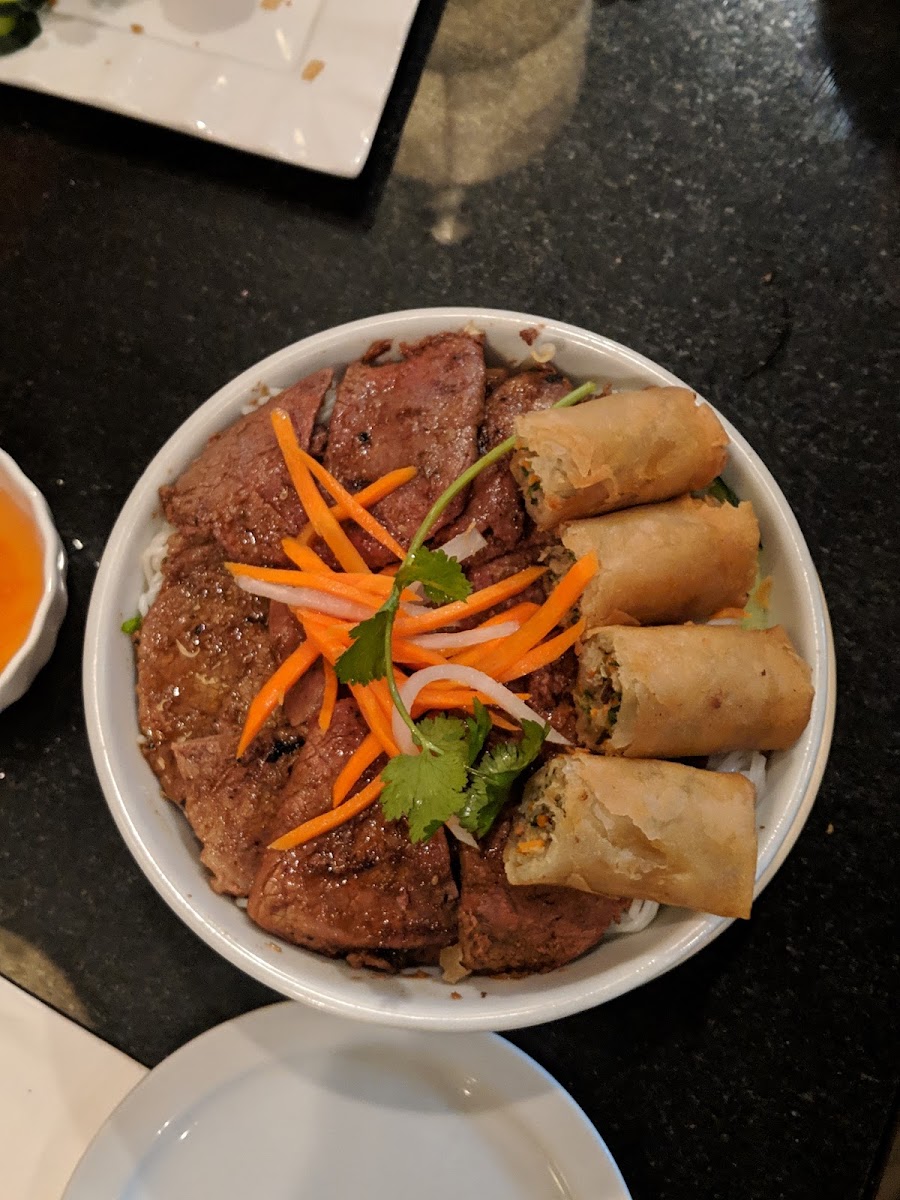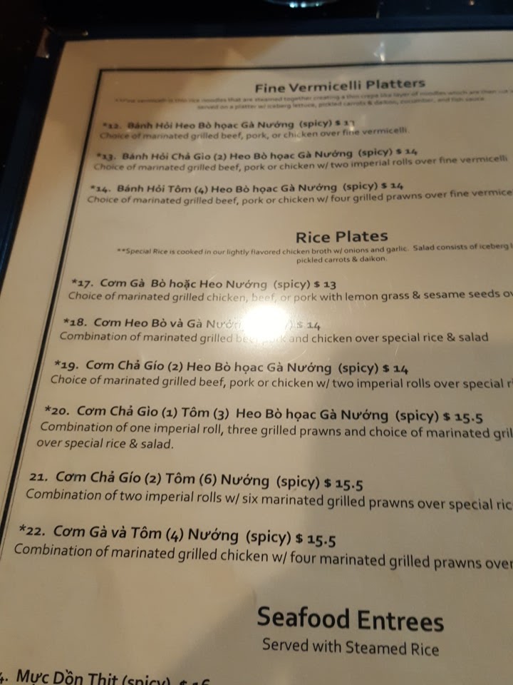 One of the standout dishes on the menu is the Spicy Lemongrass Beef Soup (Bun Bo Hue), featuring a harmonious blend of flavors from rich beef broth seasoned perfectly with lemongrass and a touch of spicy shrimp paste. This dish, priced at $20, features slow-cooked beef shank alongside sliced steamed pork sausage, served on a bed of rice noodles, and enticingly garnished with fresh herbs and shaved cabbage. It's a must-try for anyone looking for an explosive flavor experience.